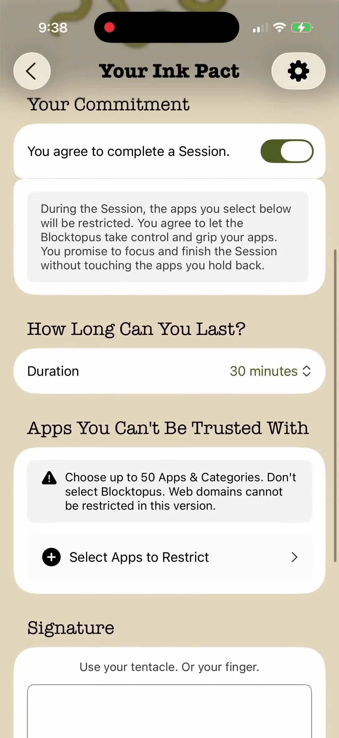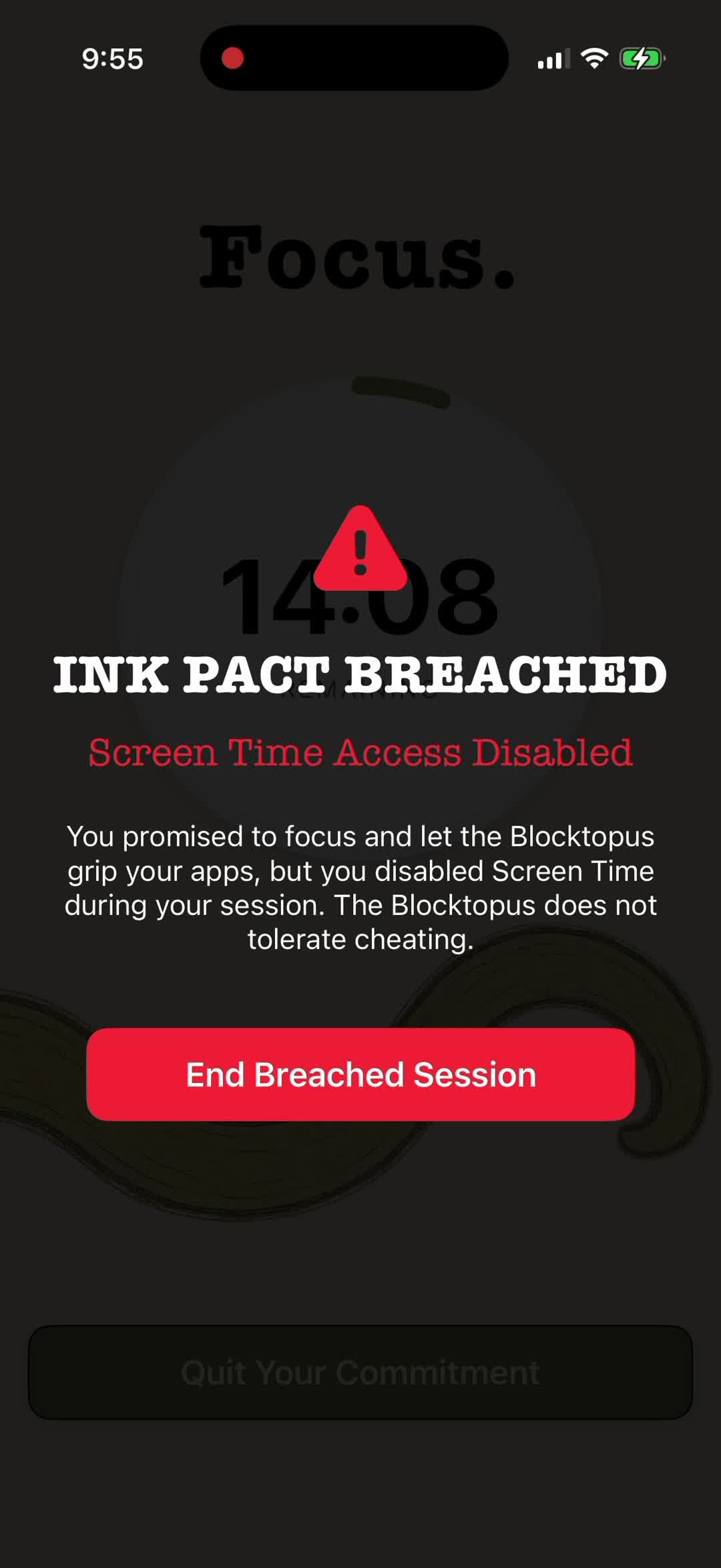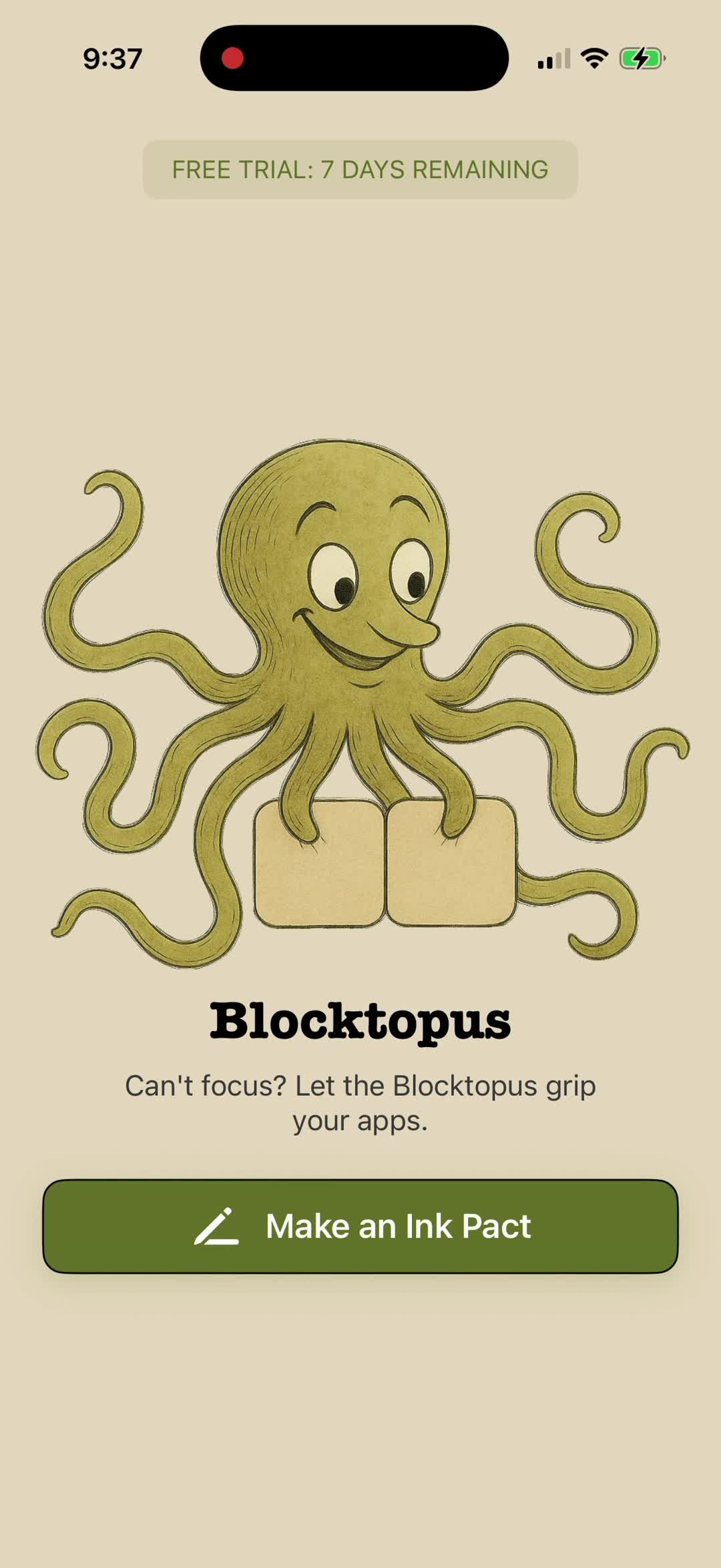 A look at what’s coming… Sign Up for Beta Skip to Videos Demo Videos | 1. Open Blocktopus 2. Make Your Ink Pact 3. Hold Back Your Apps and Focus 4. Go To Completion 5. (Don't) Finish Early 6. Don't Cheat 7. Hold Yourself Accountable