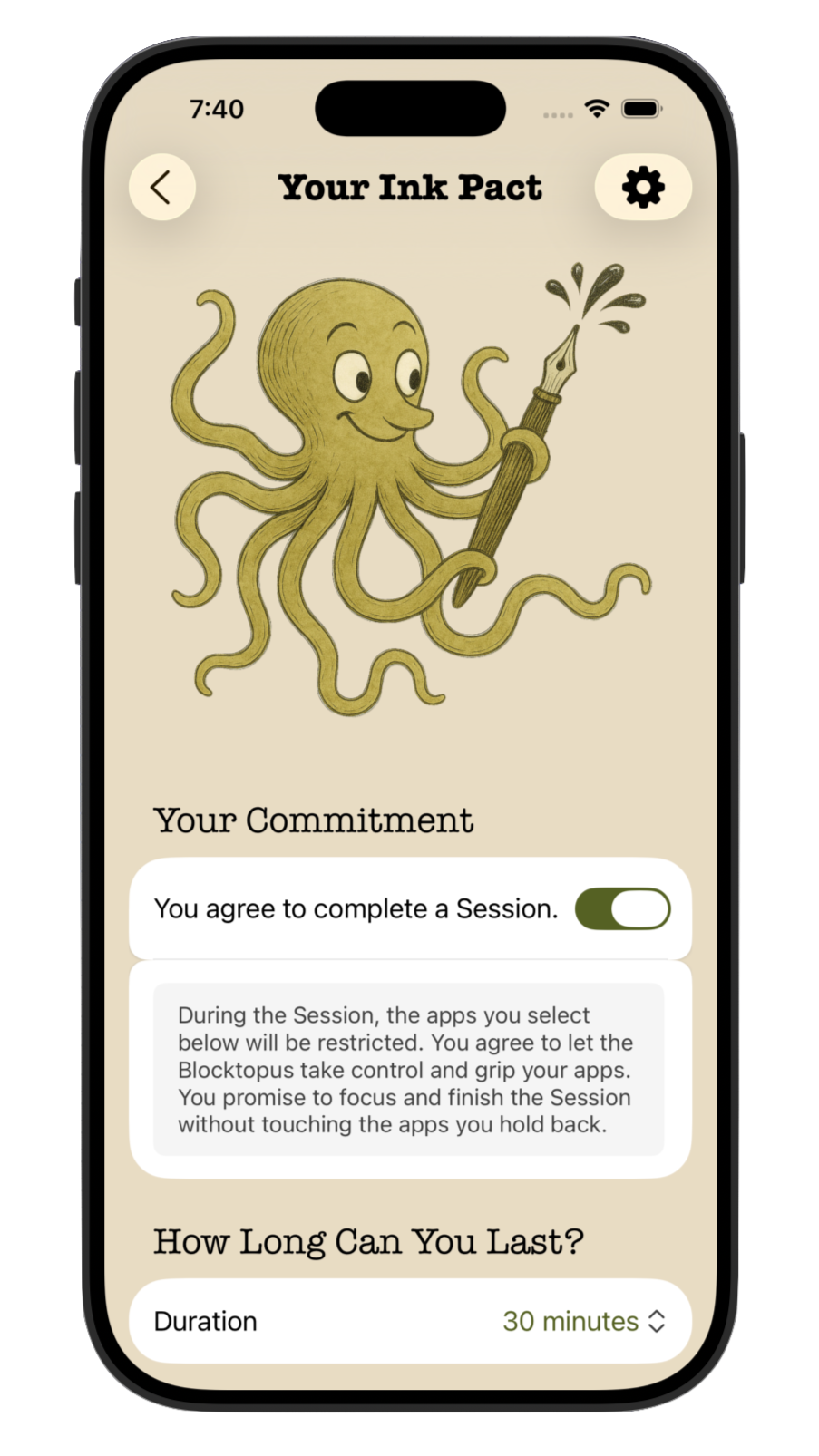 The Blocktopus uses Apple’s Screen Time enforcements to hold you to your commitment.
